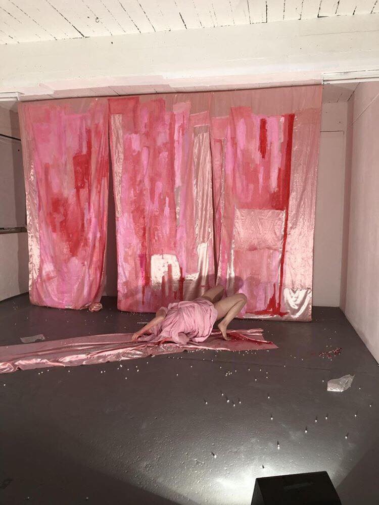 In Performing Pink Part, performance artist Gemma Jones confuses glamour with the repulsive to create a three hour live performance concluding her three month residency at Stryx Gallery. Using costume pearls, satin fabric and eyeshadow pigment, the transforming body navigates within a tableau vivant finding liberation, and complications of the colour ‘pink’. Jones creates a loose script of many possibilities that is subject to change from rehearsals of studio experiments informed by